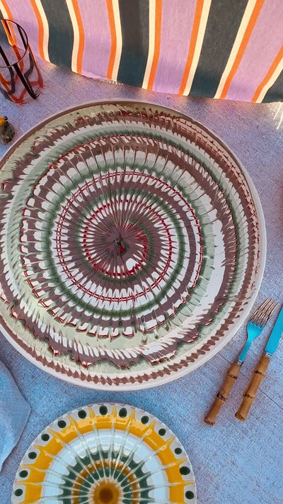 Diese außergewöhnliche große Keramikschale (42 cm) aus handgefertigter italienischer Keramik ist ein echtes Statement Piece. Mit ihrer großzügigen Form und dem ausdrucksstarken, handgemalten Muster wird sie sofort zum Mittelpunkt jeder Tisch- oder Interior-Situation.
